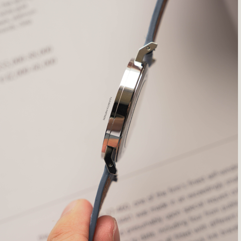 This lightness extends beyond color into the details. The Arabic numerals are printed in blue, creating a cool contrast against the warm dial, while their slightly geometric forms lend a sense of playful clarity. The minute hand is deliberately elongated, sweeping across the dial like a single, confident stroke.
