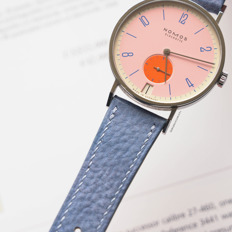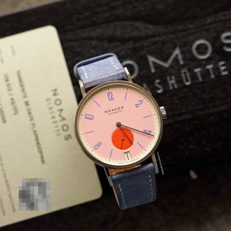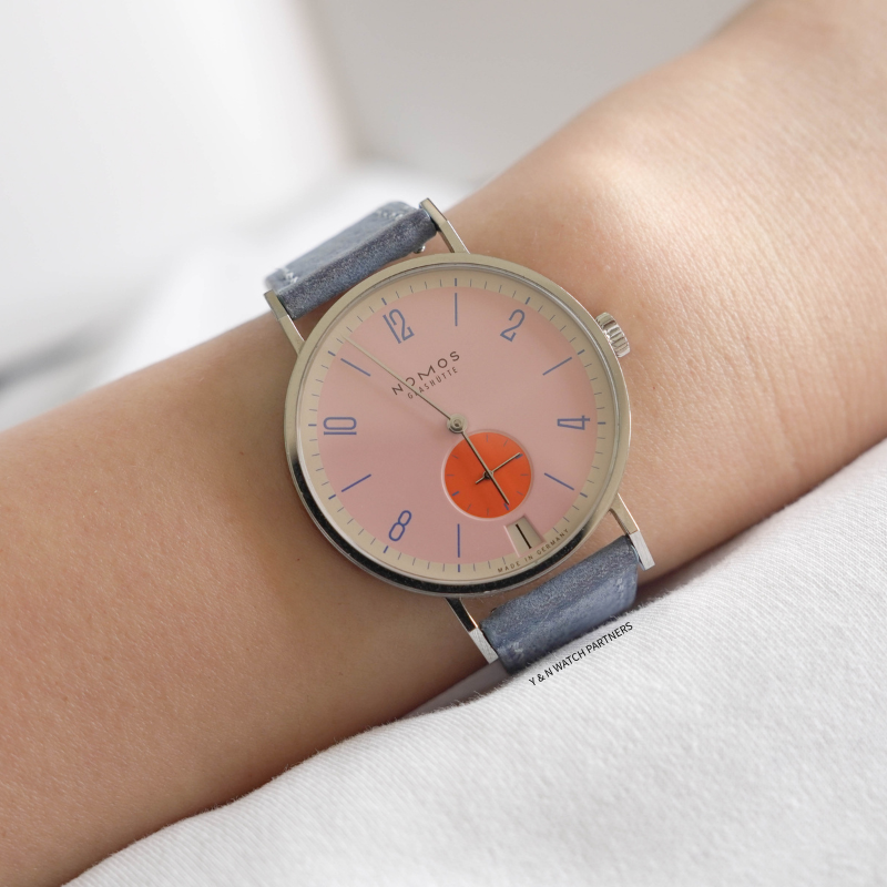 This consignment NOMOS Tangente 38 Datum “Flamingo Pink” is in excellent condition.